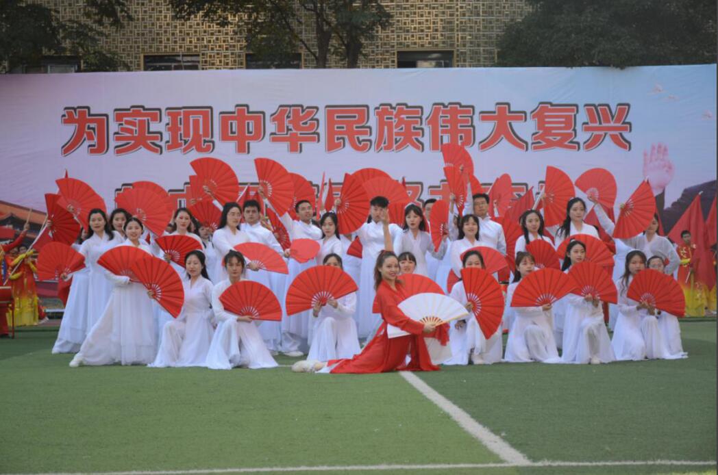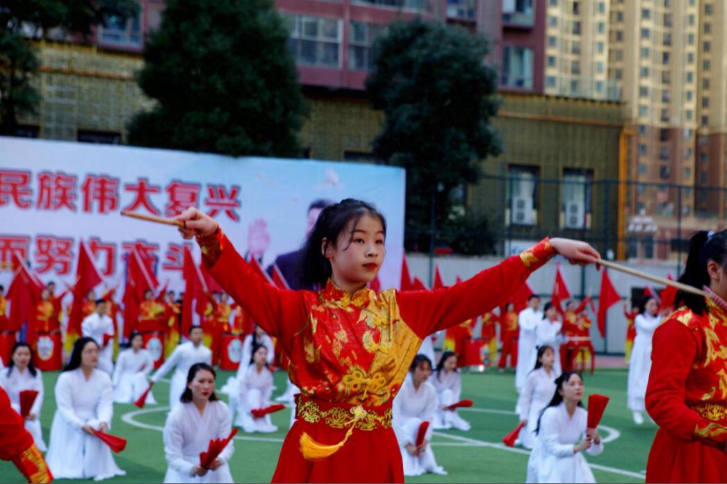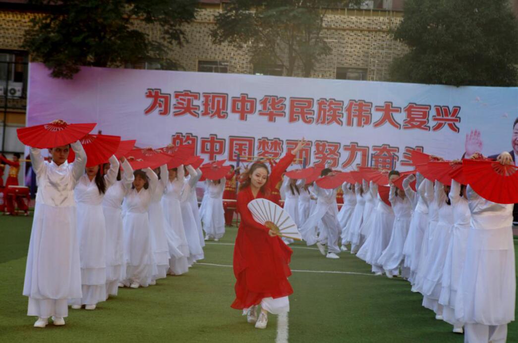 (师生共同演绎的旗鼓舞功夫扇《中华好儿女》表演现场)