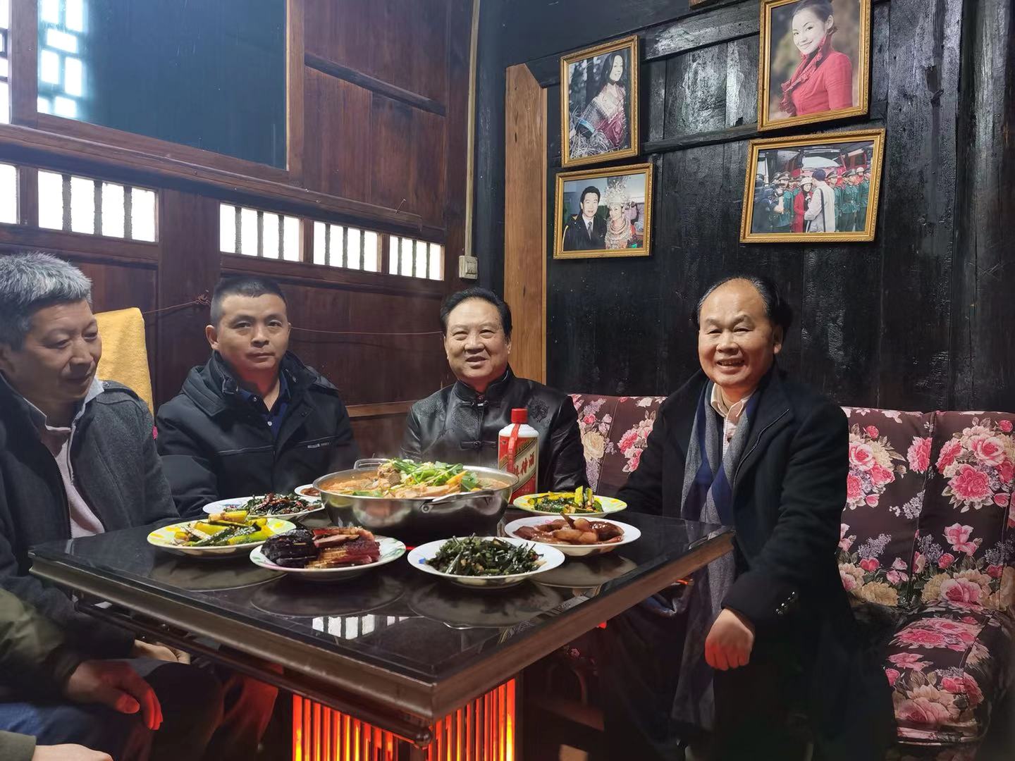 我们围着火炉享受苗家美食,村委会主任也应邀参加。阿幼朵三姐不停地给客人夹菜,三姐夫不停地给我们盛酒,其实杜先生不饮酒,这种场合他也破例饮用一杯,三姐不停地说起雷家家族史,大有“雷家掌舵人”之风范。由于我和杜先生比她年长,我说敬三妹和三妹夫一杯酒,没想到她说“你们都得跟着阿幼朵喊我三姐”,我很快反映过来:这是压倒性的,权作尊重风俗,我们苗族女人就这样直爽!
