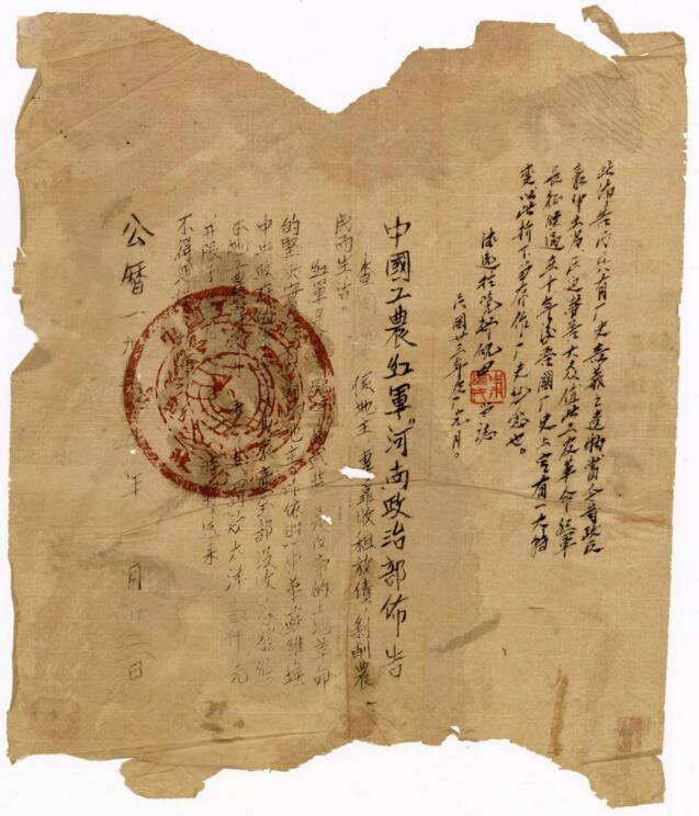 最近,在国家长征公园建设红色文化挖掘过程中,根据梁云星先生《随红军“长征”七天七夜的乡绅》一文提供线索,得知上世纪80年代初,在革命后代周德逸大力支持下,贵州省博物馆曾在赤水县征集到一张《中国工农红军河南政治部布告》并收藏。赤水市长征办通过市档案馆多方协调,得到当年这张布告的照片。布告如下: