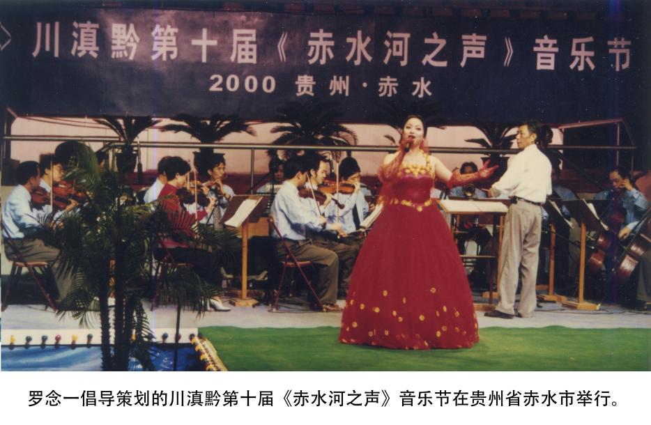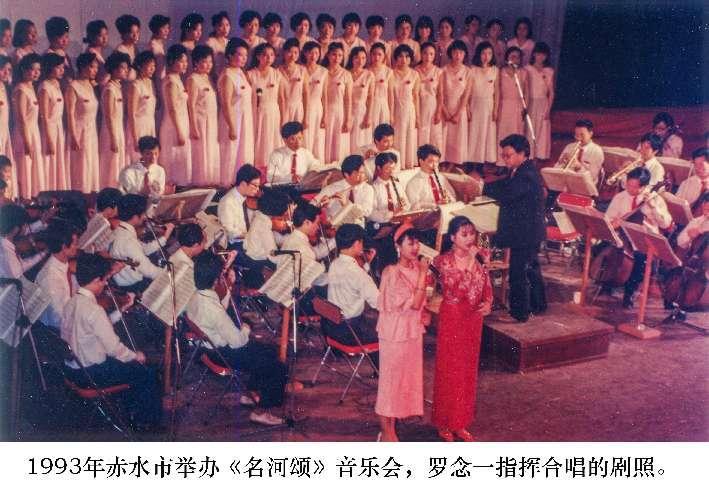 在赤水市老年活动中心排练大厅,当年罗念一老师己是近花甲之年的老人,而他老当益壮,演员们的热情使他废寝忘食,时常将节目排练到深夜才回到他下榻的宾馆休息。由于在这台音乐会的工作中,我每天都要与他打交道,久而久之,从相识到了熟识的程度。一天,我突发奇想,我就对他说决意要采访他。他谦虚地摆了摆手说:“没有什么好采访的,有生之年,有幸回到生我养我养我的故乡赤水,为家乡人民尽绵薄之力是我义不容辞的职责和义务……”顺着他的话茬,采访在谈笑风声中进行。