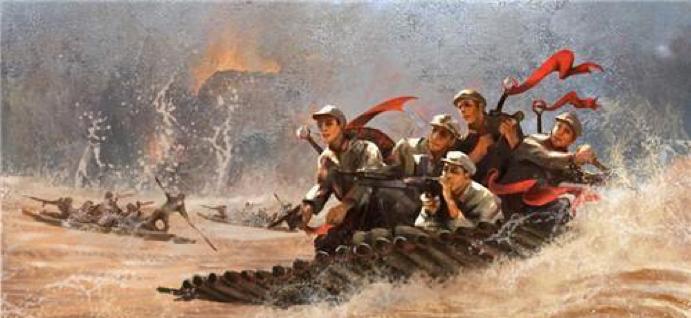 在嘹亮的冲锋号中,小船乘风破浪,驶过河流,抵达对岸……