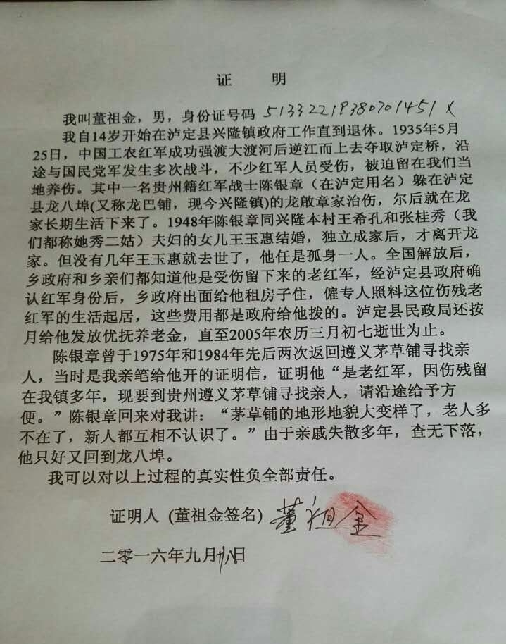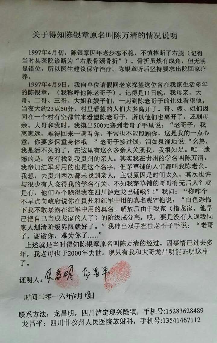 “从1936年到1948年,陈银章就住在我家阁楼上,我们兄妹几个都叫他陈老哥子。”龙昌平说:1948年,母亲为29岁的陈银章说了门亲事,陈银章结婚后,就离开了龙家,自立门户。在此之期间,陈银章于1975年至84年期间先后四次前往贵州遵义寻亲,都无功而返。