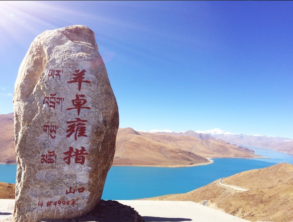 羊卓雍错,藏语意为“碧玉湖”、“天鹅池”,是西藏三大圣湖之一,俗称羊湖,是远古冰川泥石流,堵塞河道而形成的高原堰塞湖。羊卓雍错,“羊”:上面;“卓”:牧场;“雍”:碧玉;“错”:湖。连起来就是“上面牧场碧玉之湖”。羊湖,处于雅鲁藏布江之南、山南浪卡子县境内。湖面海拔4441米,东西约130千米,南北约70千米,湖岸线约250千米,水面积638平方千米,是杭州西湖70倍,喜玛拉雅山北麓最大内陆湖。雅鲁藏布江把羊卓雍错和拉轨岗日山隔开,遥遥相望。拉轨岗日山,是西藏中部四大雪山之一,藏民把它的主峰叫做“宁金抗沙”,意思是“夜叉神住在高贵的雪山上”。宁金抗沙峰海拔7000余米,于江孜县和浪卡子县之交界处,山势雄伟,危岩嵯峨,峰岭沟壑间,终年积雪,造就冰川千年,古老而晶莹剔透。著名卡若拉冰川,位在其南麓。江河、湖泊、雪山、蓝天,融为一纸图案。江流汹涌,如万马狂奔。湖水如镜,映蓝天白云。山似天梯,直插苍穹。天蓝如海,浩渺无尘。此乃佛国世界,人间仙境。藏民歌曰:“天上的仙境,人间的羊卓。天上的繁星,湖畔的牛羊。”