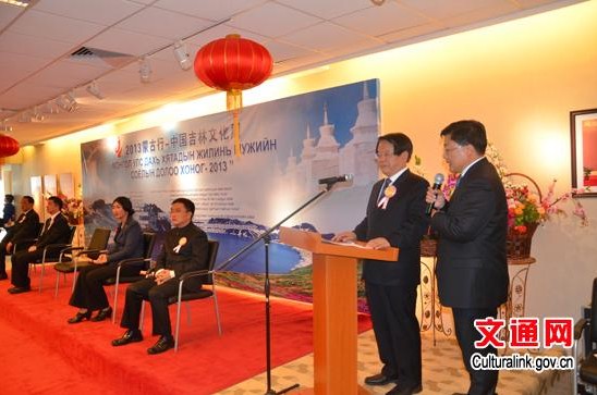 乌云格日勒在致辞中高兴地说,她与蔡武部长进行了愉快又卓有成效的会谈,签署了2013年蒙中两国建交65周年之际互办文化周备忘录,这将有力促进两国文化交流、合作再上新台阶。热烈祝贺“吉林文化周”在蒙古国举办成功。蒙古国中央省与中国吉林省是友好省份,“吉林文化周”活动的举办为蒙古人民了解中国吉林提供了很好的机会。同时,还有中国山西省的歌舞在乌兰巴托演出,这些层见叠出的中国文化活动对增进两国友情,推动两国合作发挥了重要的作用。