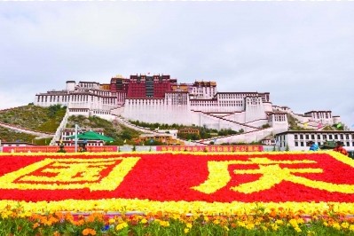 9月30日,西藏拉萨布达拉宫广场上用旧绢花拼成“国庆”字样。