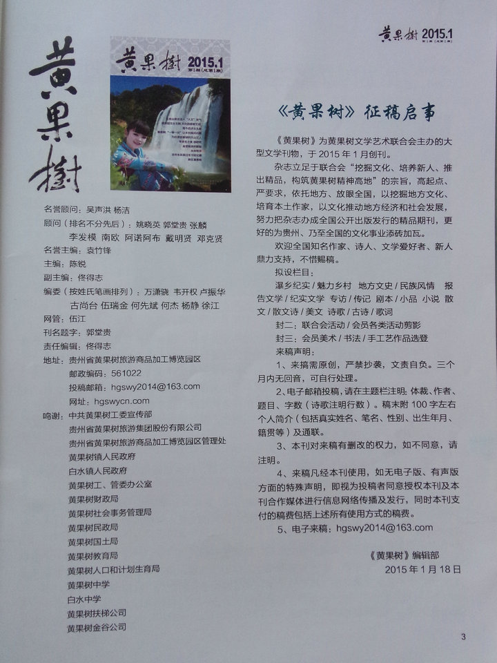 《黄果树》杂志赠样刊、有薄酬,欢迎全国知名作家、诗人、文学爱好者等不吝赐稿、鼎力支持!
