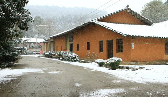 一望皑皑乡野素,久别桑梓村前伫。飞雪探春轻曼舞,坪场处,羊犬闹后痕无数。