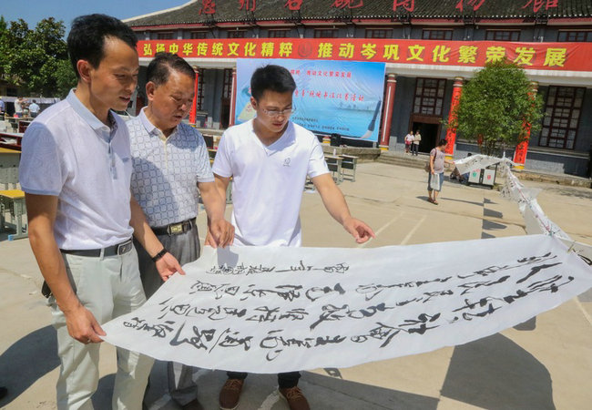 日前,贵州省岑巩县思旸镇在思州石砚博物馆门前举办了“手抄党章”现场书法比赛活动,来自该镇的70余名书法爱好者参加了活动,为庆祝建党九十五周年献礼。