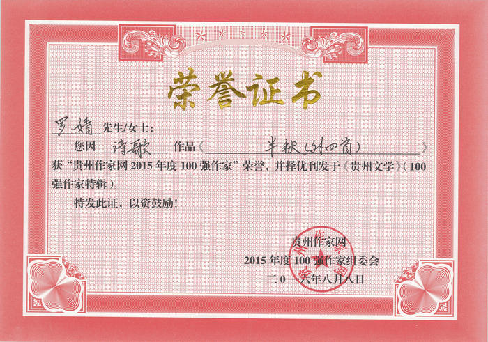 最后,我要代表贵州作家网-《贵州文学》编辑团队,热烈祝贺进入100强的作家朋友:是你们的积极参与,为此次活动增光添彩;是你们的默默耕耘,孕育了不朽的篇章;是你们的精神蜡烛,照亮了晦暗的灵魂!