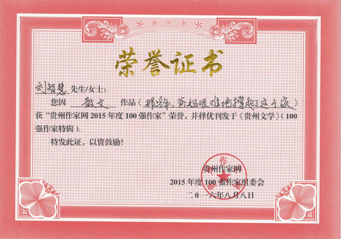 再次,我要说的是:为文者,心力交瘁。近几个月以来,我拼命工作、省吃俭用地存钱出版《贵州文学》(贵州作家网“2015年度100强作家”特辑),当我在群里说自己所存的钱还不够出版费用后,便立即收到了数位文友毫不犹豫的赞助,这让我在感动、感恩之余,深感责任重大,所以,我并非全搬100强作家作品,而是择优刊发,且对部分作品作了适当修改润色,使得《贵州文学》(贵州作家网“2015年度100强作家”特辑)更具权威性、品鉴性、纪念性。