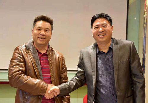铜仁市作协现任主席龙险峰(左)与上任主席安元奎(右)握手