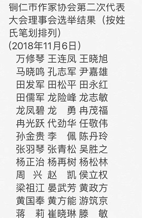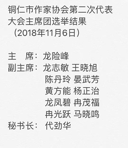 铜仁市作家协会第二次代表会议于2018年11月6日在铜仁召开。市文联党组书记、主席周慈,副主席谭晓红、刘照进,市民政局张晓钦科长到会作指导并讲话。会议修改了作协章程,选举了新的一届理事会和主席团。龙险峰任铜仁市作家协会主席。