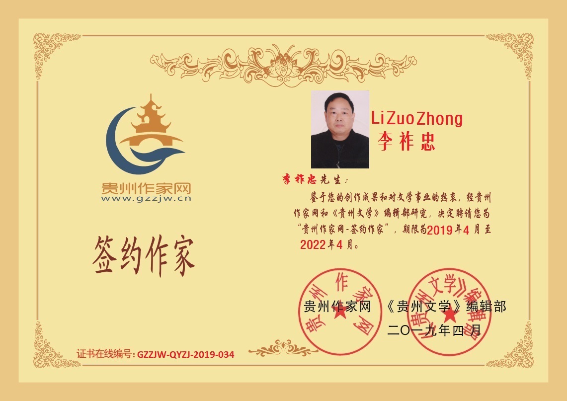 2019年4月12日,湖北省作家李祚忠成功签约贵州作家网。