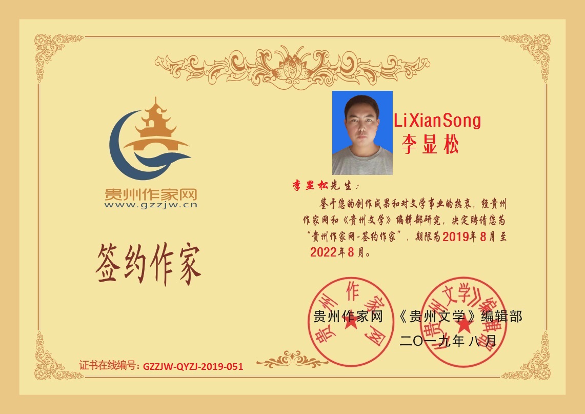 2019年8月18日,云南青年作家李显松成功签约贵州作家网。
