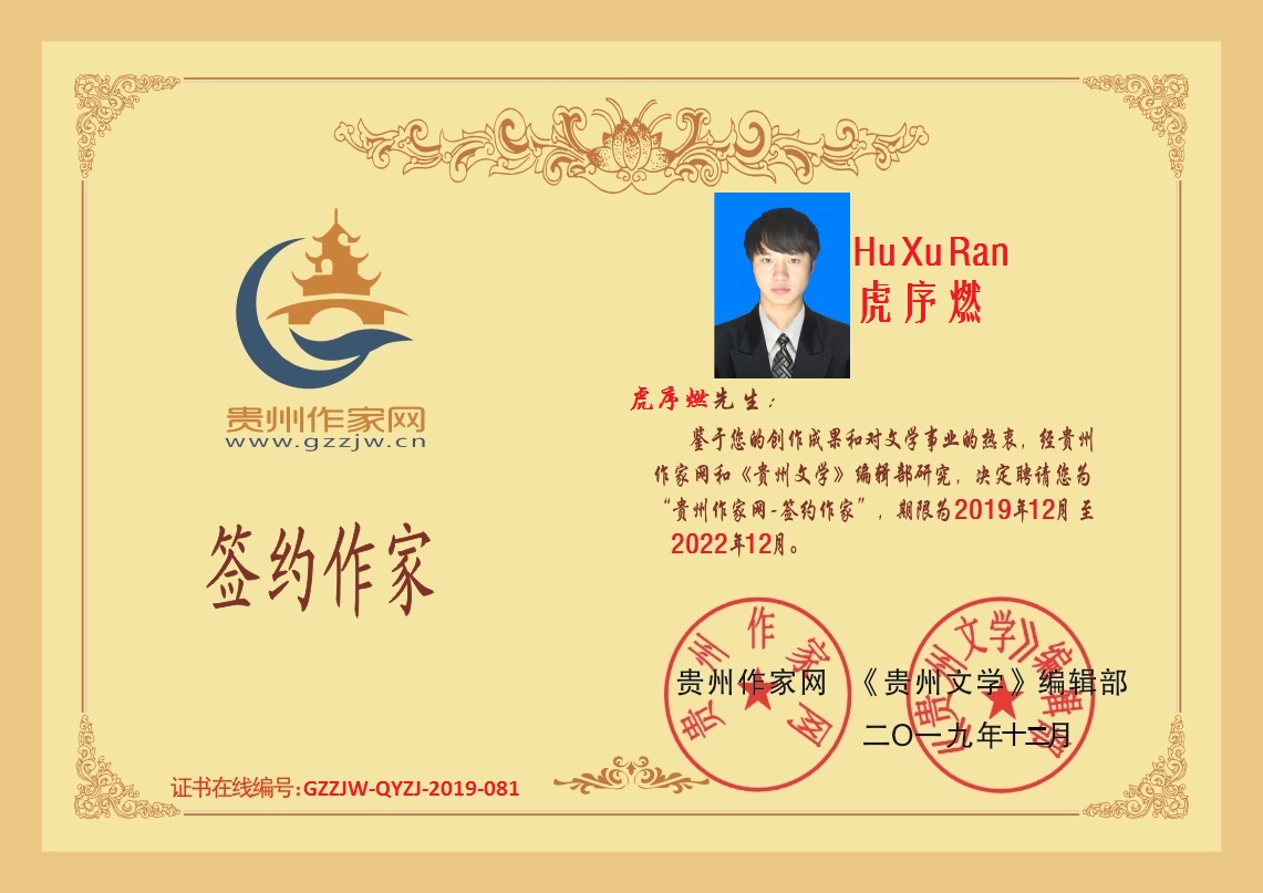 2019年12月24日,贵州省威宁县青年作家虎序燃成功签约贵州作家网。