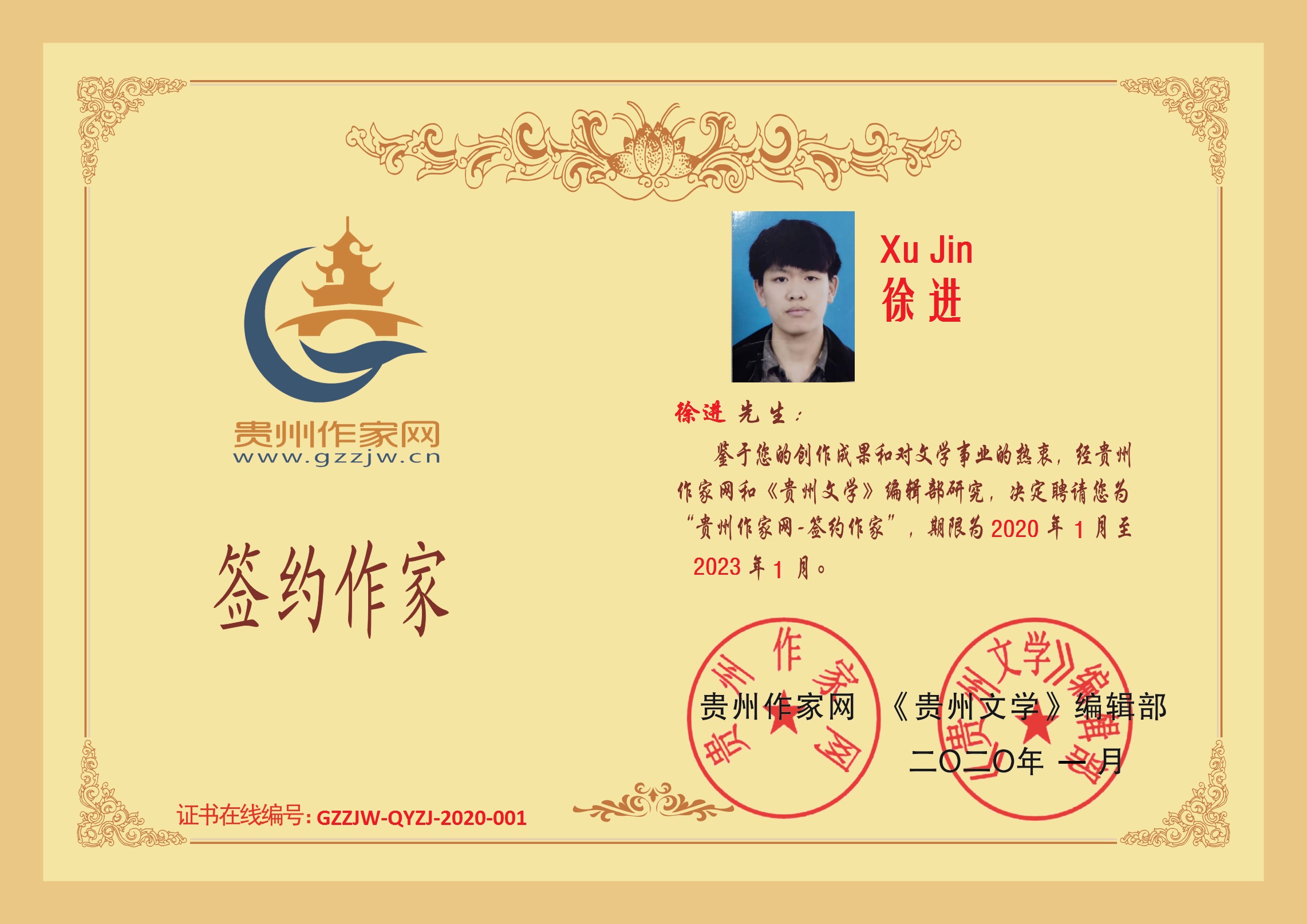 2020年1月14日,贵州毕节青年作家徐进成功签约贵州作家网。