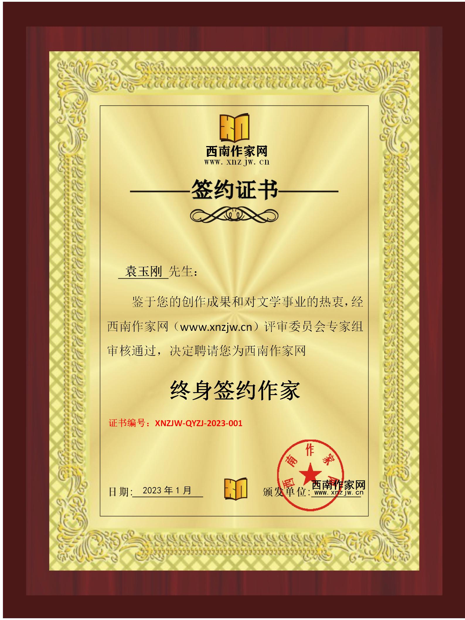 袁玉刚,字庆得,号皓寒,又号蚕雪,别号高枧居士,大学本科文化,中共党员,政工师。贵州省诗词楹联学会会员,西南作家网专家组成员、贵州作家网签约作家、西南作家网终身签约作家、中国诗歌学会会员,中华诗词学会会员,经典文学网等多家媒体签约诗人,贵州省习水县袁世明世家历史文化研究会副会长兼副秘书长。诗文多散见于报纸、杂志和贵州作家文学、贵州诗词网、西南作家网、中国诗歌网、中国作家网等主流网络媒体。数百篇(首)作品入选国家级及省部级出版社出版的《当代文学百家》、《当代影响力诗人作家文选第二卷》、《中国诗文百家》等多部文学选集。