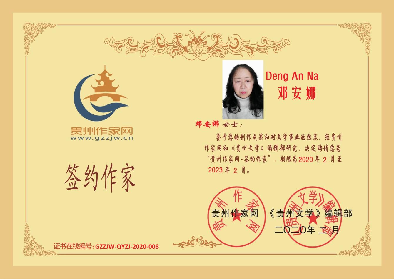 2020年2月17日,贵州省贵阳市女作家邓安娜成功签约贵州作家网。