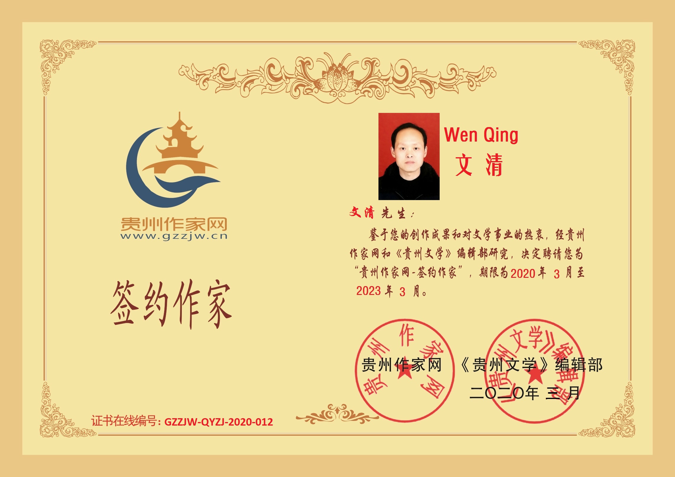 2020年3月1日,湖北阳新县作家文清成功签约贵州作家网。