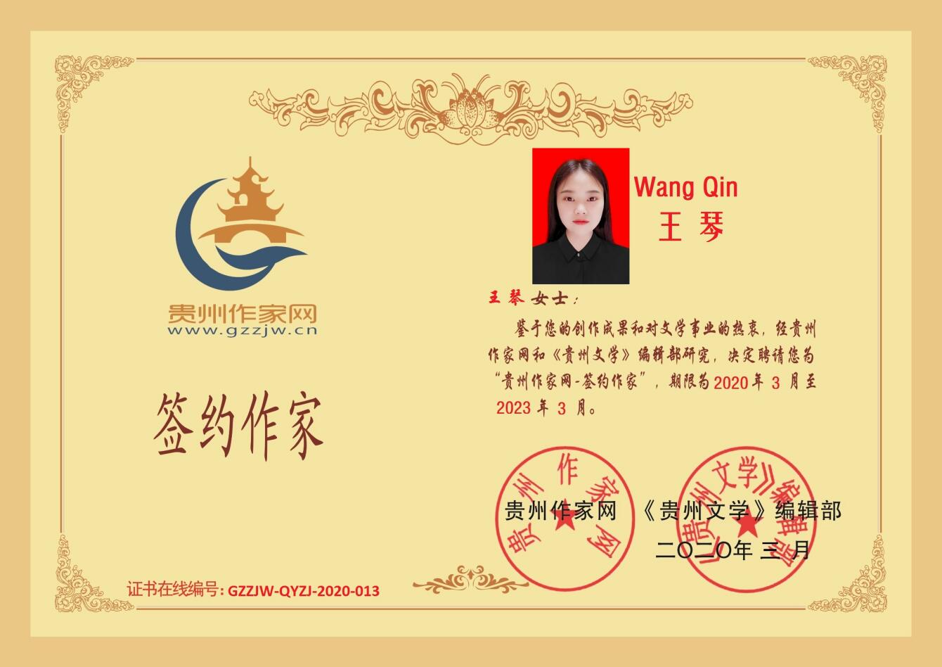 2020年3月7日,贵州省思南县青年女作家王琴成功签约贵州作家网。