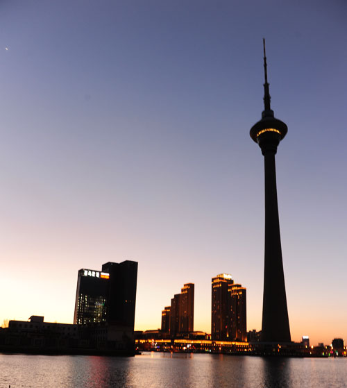 我伫立在天塔湖边,落日的余晖光辉灿烂。