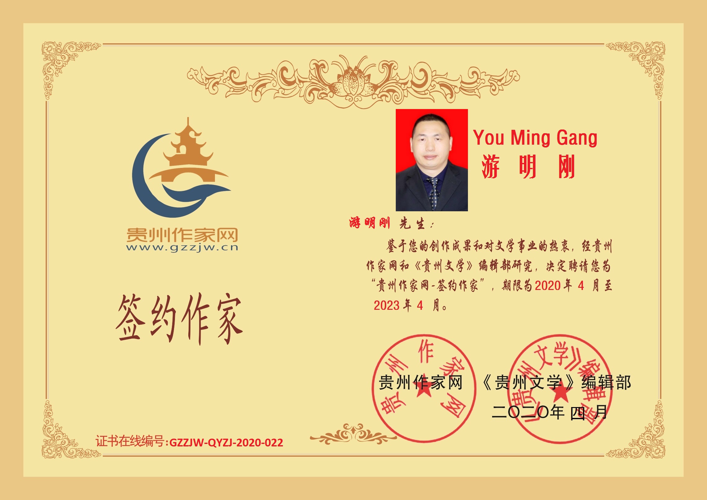 2020年4月23日,贵州遵义苗族作家游明刚成功签约贵州作家网。