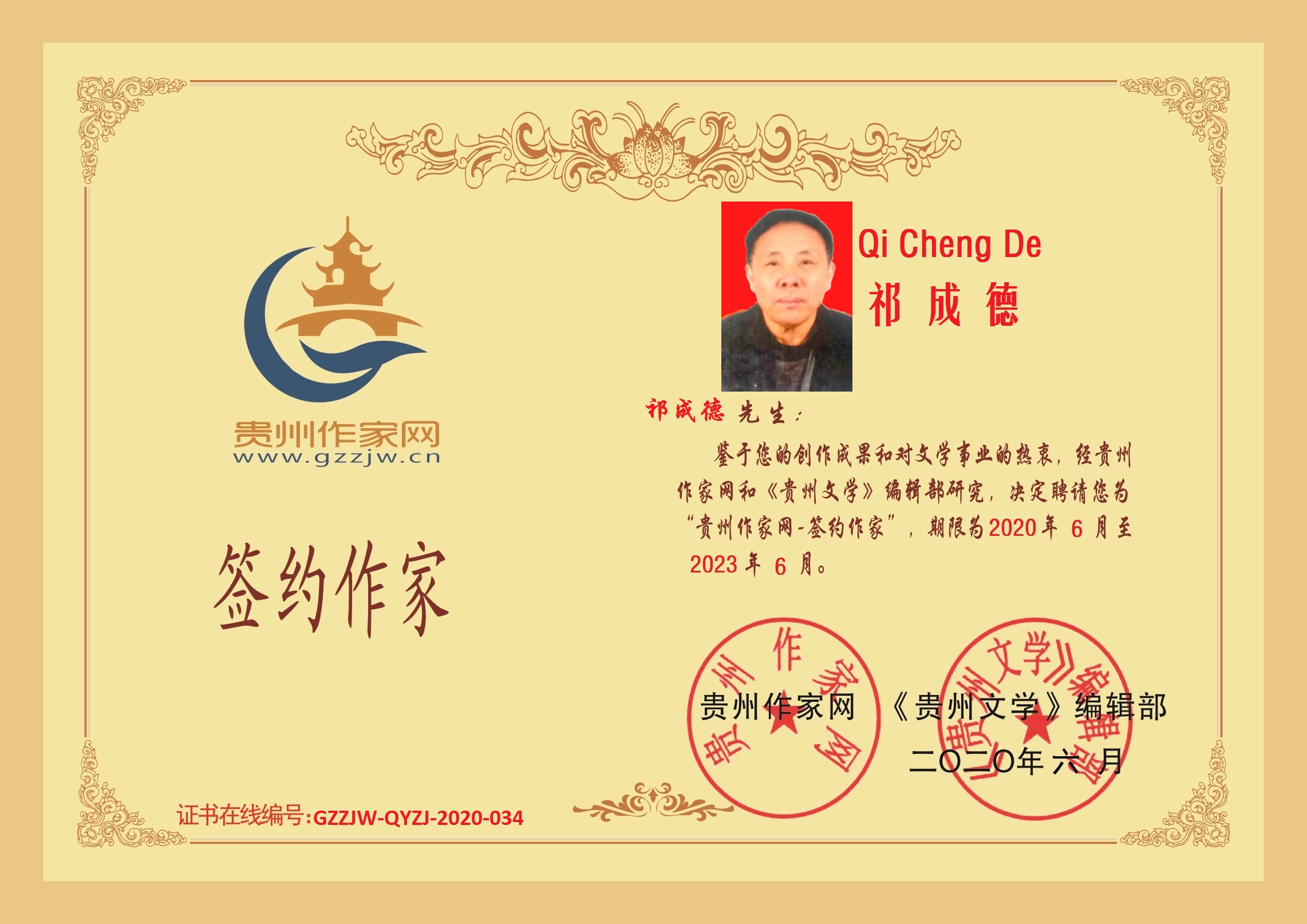 2020年6月8日,贵州省赤水市作家祁成德成功签约贵州作家网。