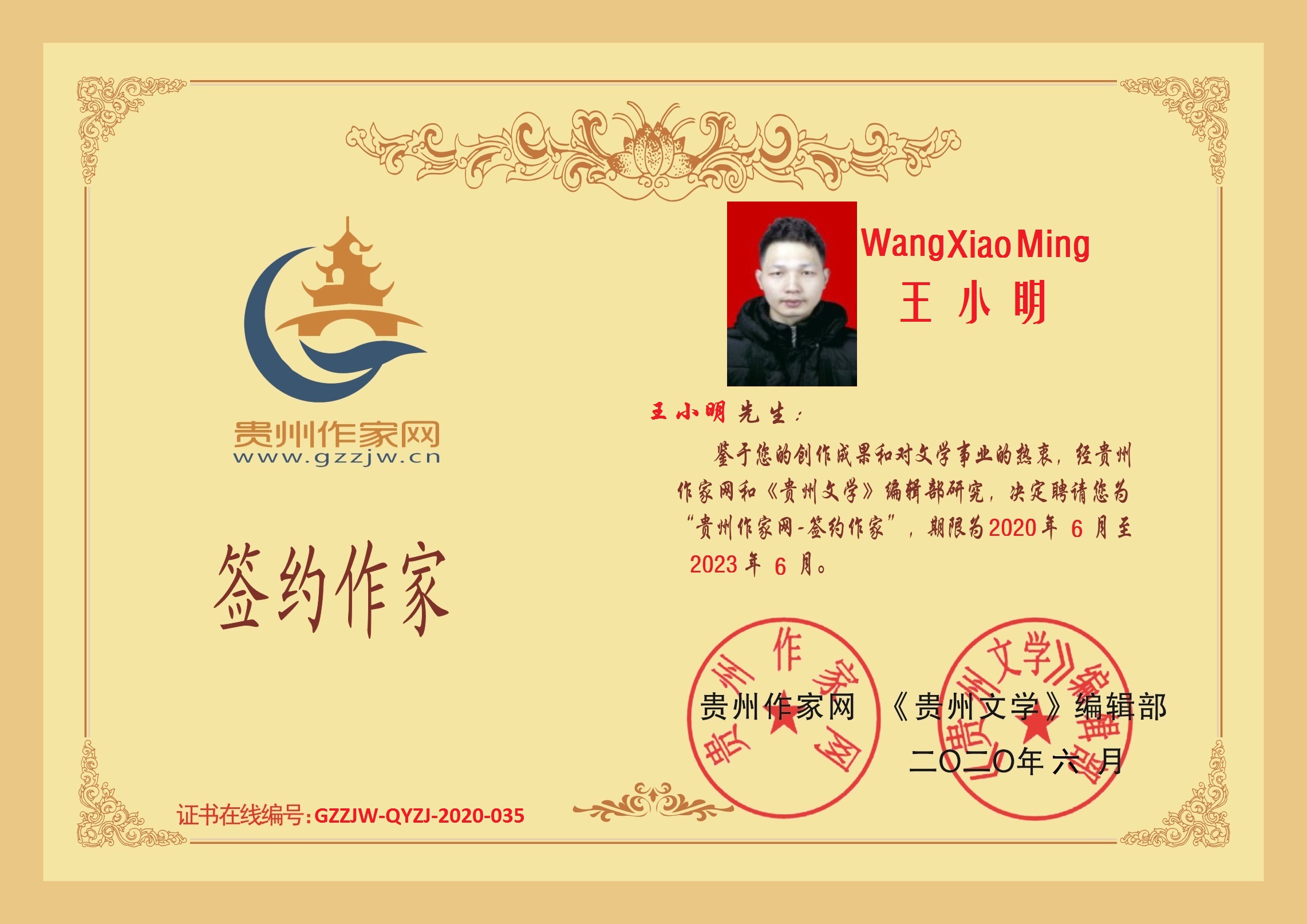 2020年6月8日,江西省萍乡市90后作家王小明成功签约贵州作家网。