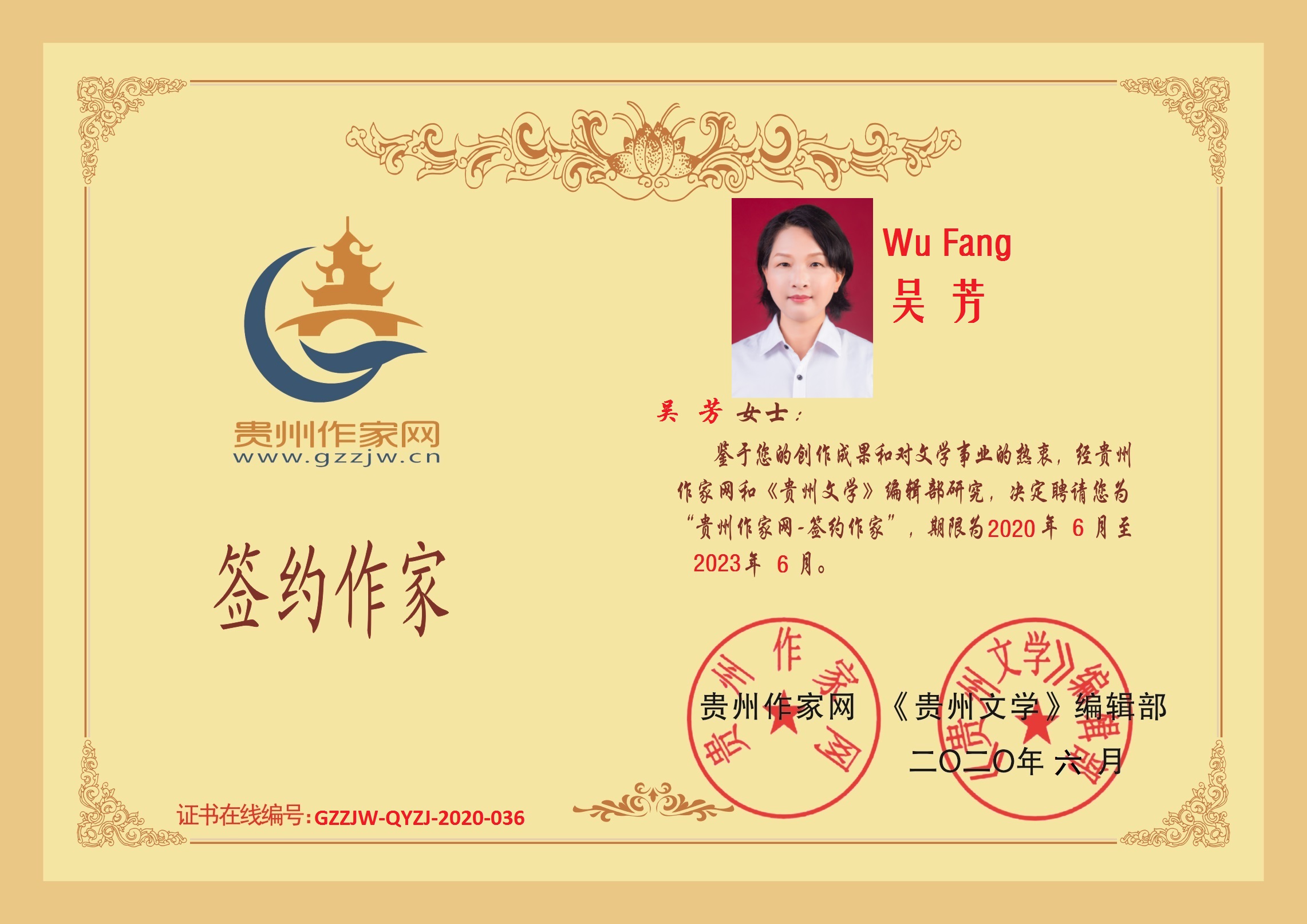 2020年6月10日,江西省九江市女作家吴芳成功签约贵州作家网。