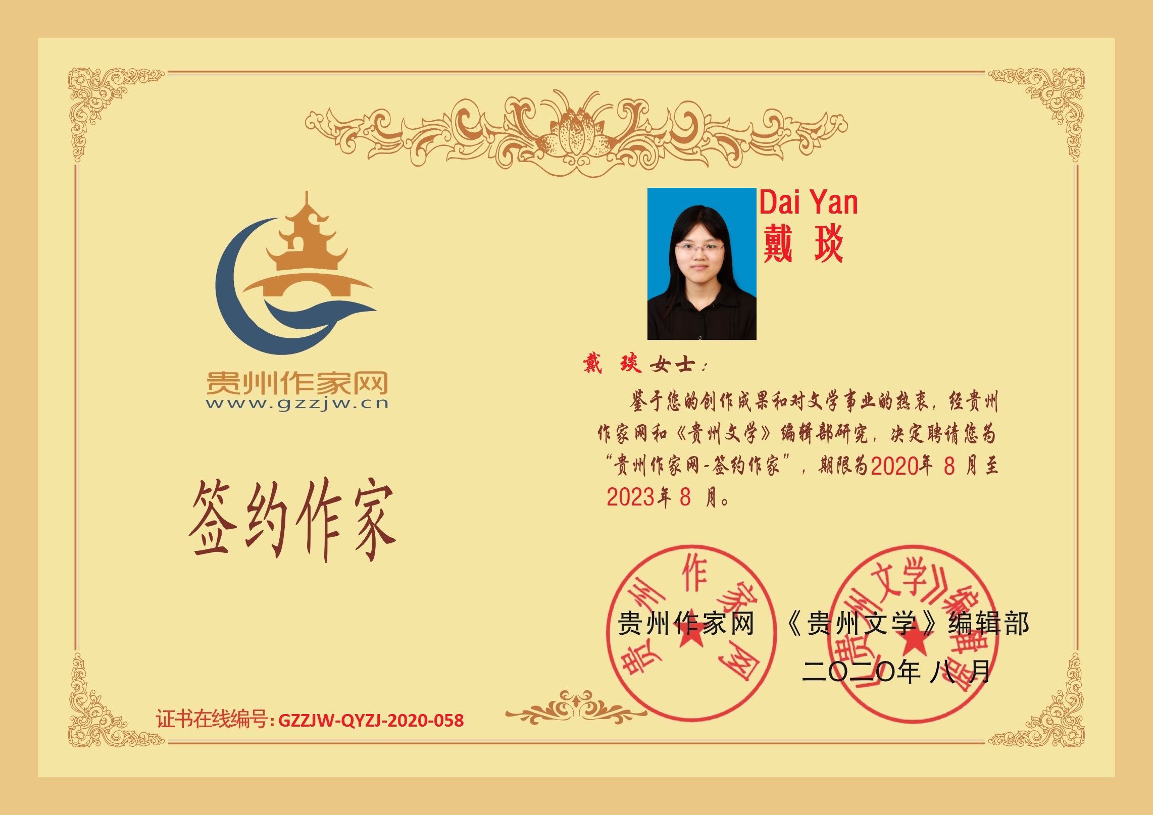 2020年8月26日,江苏泰州市青年女作家戴琰成功签约贵州作家网。
