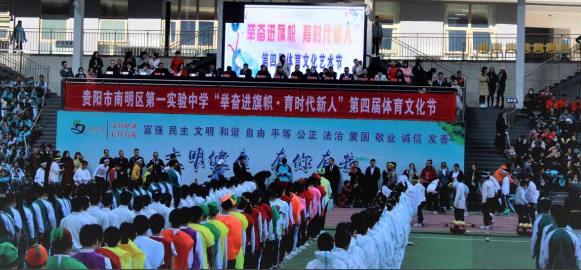 20201112日,贵阳市南明区第一实验中学第四届体育文化艺术节在学校大操场隆重开幕。本次活动以举奋进旗帜·育时代新人为主题,旨在高举奋进旗帜,弘扬时代主旋律,丰富师生校园文化生活,展示学校特色教育的成果,展现学校学生的青春风采和精神风貌,培育有梦想、有艺术、有品位、欣赏美、能健康的新时代少年,更好加快校园文化精神文明建设,扎实推进阳光体育运动又好又快发展,办好人民满意的教育。