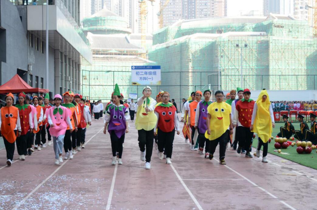 伴随着雄壮的《运动员进行曲》,国旗班、滑轮、美术、科技、节约粮食、疫情防控、法治等既有浓厚校园文化特色,又有新时代元素的11个方阵依次入场。整齐划一的步伐、嘹亮坚定的口号,展示出全校师生意气风发的精神风貌与蓬勃向上的精神活力。入场表演中,各方阵用动感的舞蹈、创意的方式等一系列精湛的表演展现了南实一中学子青春活力、蓬勃向上的精神风貌,体现了本次运动会主题,诠释了学校智慧成长,卓越发展的办学理念,表达了对本次运动会的期盼和祝福。