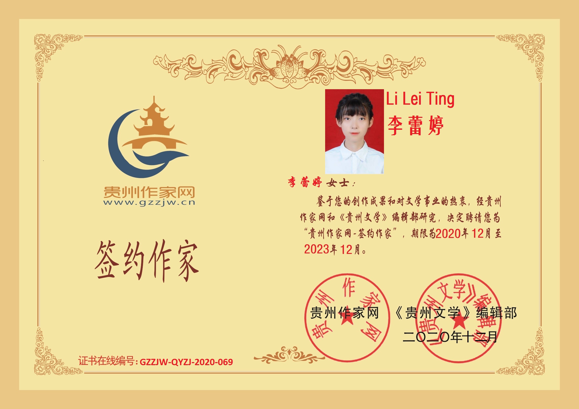2020年12月30日,陕西省宝鸡市青年女作家李蕾婷成功签约贵州作家网。