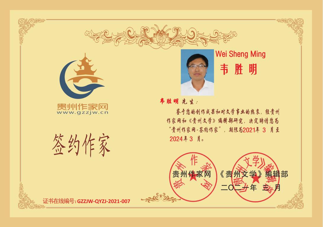 2021年3月12日,贵州省遵义市仡佬族作家韦胜明成功签约贵州作家网。