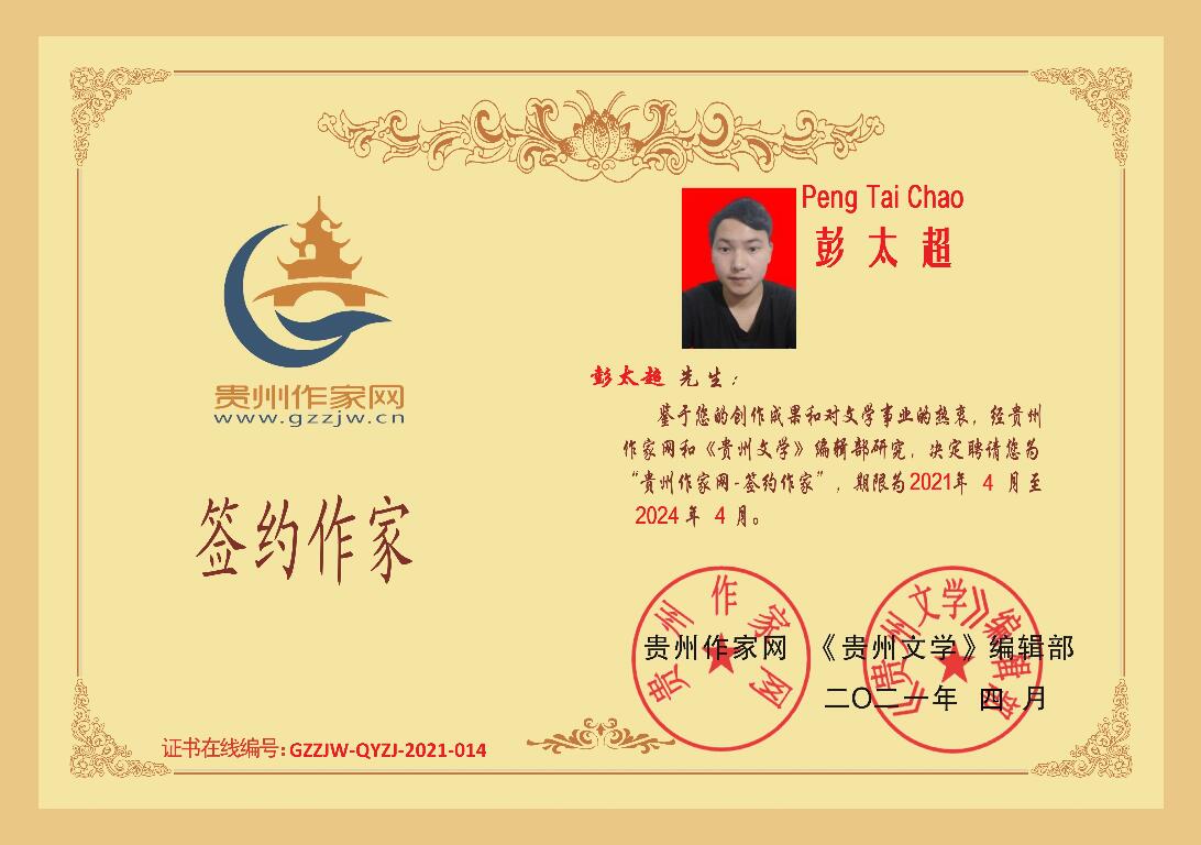2021年4月16日,贵州省黔东南州侗族作家彭太超成功签约贵州作家网。