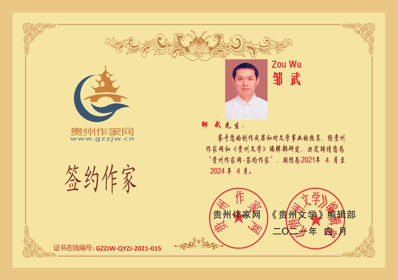 2021年4月24日,贵州省遵义市仡佬族作家邹武成功签约贵州作家网。