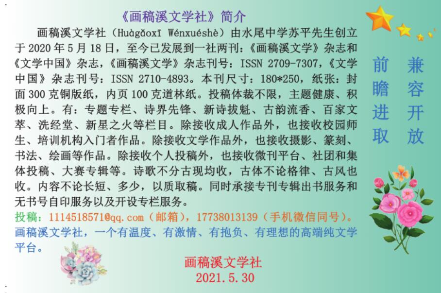 【作者简介】苏平,叙永县水尾画稿溪人,1999年毕业于西南师范大学汉语言文学教育专业本科。画稿溪现代诗歌传承人,笔名木子,字白山,号顽石,洗经堂入室二师兄,一得居主人。画稿溪文学社、《画稿溪文学》杂志和《文学中国》杂志的创始人、社长、主席、总编。有专著《第一缕阳光》。贵州作家网签约作家,泸州市江阳区诗词楹联学会会员,四川省诗歌学会会员。诗作见于各级各类网刊报刊纸刊。