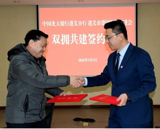 3月1日,光大银行遵义分行与遵义市爱国拥军促进会签订《共建战略合作协议》,进一步整合双方资源,就退役军人和其他优抚对象优待证申领制发,以及后续系列双拥共建活动达成战略合作。