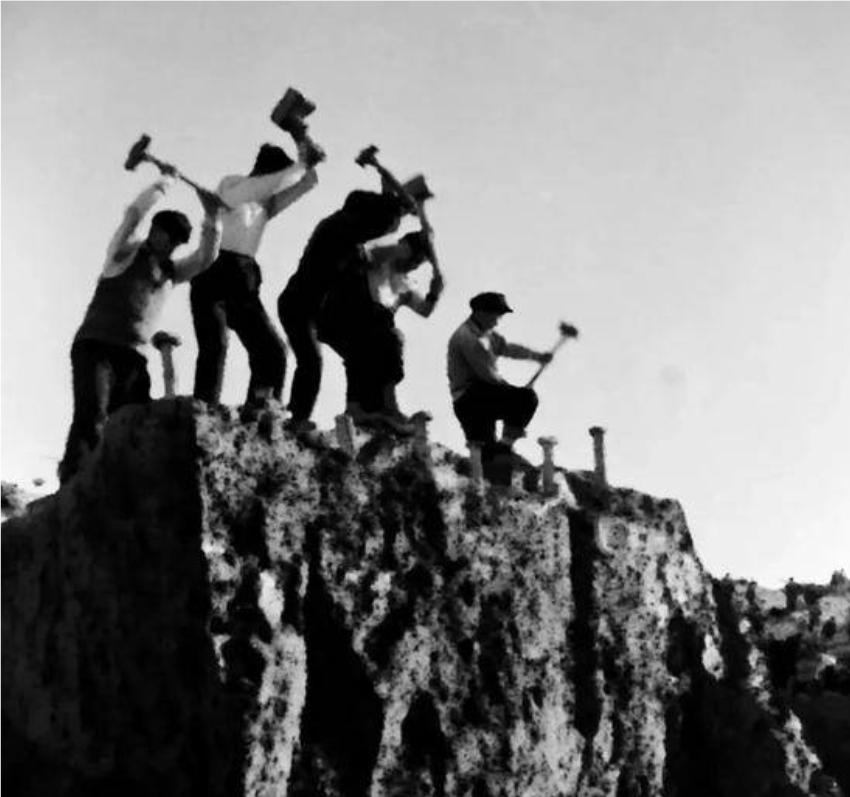 面对坚硬岩石,村里人锤打钎凿,用大锤钢钎在悬崖峭壁上打炮眼。打炮眼必须二人配合,一人扶正钢钎,一人扔大锤砸钢钎。在锤砸下时,扶钎人必须扶正钎子,保证不晃动,让大锤稳准的砸在钎尾上。扶钎人在大锤挥起的瞬间,转动钎子,让钎口换个方向。当下一锤砸下来时,钎口啃掉多一丁点石碴。
