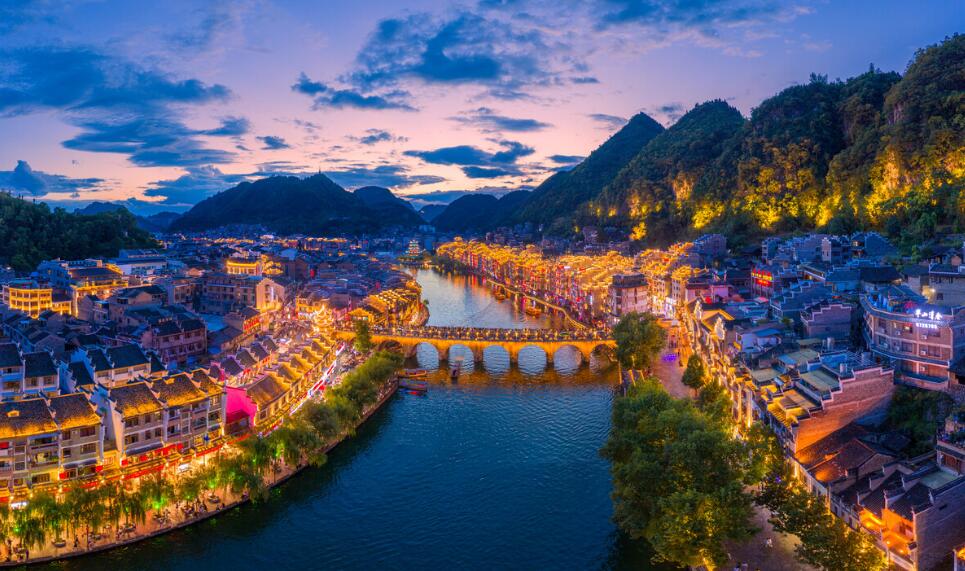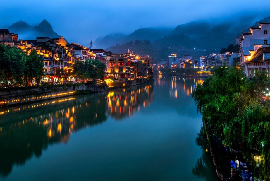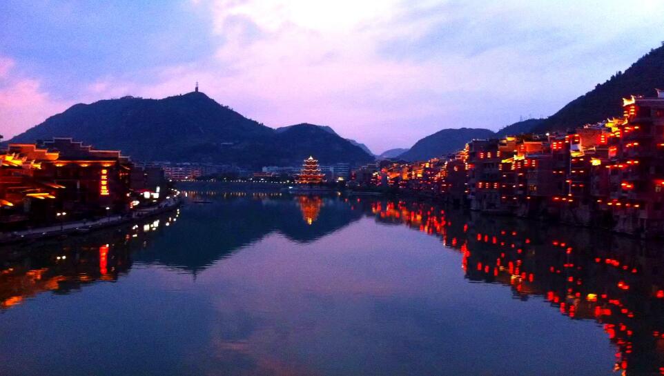 古镇依山傍水,清澈的舞阳河水从山间蜿蜒而出,穿城而过,让这座小城有了灵气。小桥流水,杨柳依依,沿着青石板铺就的街道一路向前,诗意阑珊,画意唯美,恍惚间仿佛置身于江南水乡。斜倚在祝圣桥的石栏板旁,著名的青龙洞景观尽收眼底,青砖黛瓦的亭台楼阁贴壁凌空,飞檐翘角,精巧玲珑、雕梁画栋,颇有徽派建筑的风格。古老的石桥,水中的倒影,周围错落有致的建筑与悬崖、古木、藤萝、岩石、溶洞天然合成,融为一体,像极了一幅清新淡雅的水墨画。