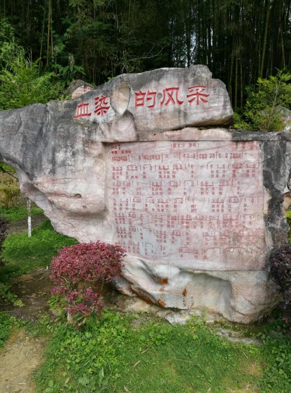 坝子的左边,绿荫如盖。在这片草坪里,伫立着几块巨大的石头。战友说去看看吧,那些巨石不普通,因为每块巨石上都刻着一首上个世纪80年代最流行的军旅歌曲。走进这些石头一看,这些石头形状各异,高明的石匠师傅先在这些石头上因地制宜地凿出一个平面,然后再在这每一块石头平面上,恰到好处地刻下一首首歌曲的曲谱,其中有《两地书  母子情》、《小草》、《望星空》、《我爱老山兰》、《血染的风采》、《再见吧 妈妈》、《热血颂》。除了《我爱老山兰》,其他几首,我全都会唱。