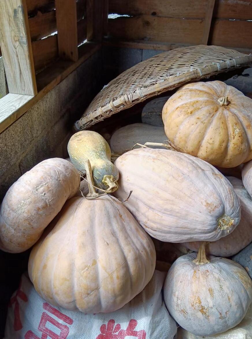 农民爷爷家的马路对面有间闲置的木屋,木屋的一个角落里存放了许多老南瓜,这些老南瓜像一群调皮的小猪挤在一起,可爱极了。瞧瞧,它们一个个体态圆润、慵懒温柔,胖嘟嘟地躺在那里,那样安逸,那样舒服,那样闲适。它们穿着橘黄色或青绿色、表皮有许多深深浅浅条纹的衣服,它们的长相有的像磨盘,有的像葫芦,有的像……原谅我,此刻,语言贫瘠的我,一时也找不出恰当的词汇来继续描述它们。