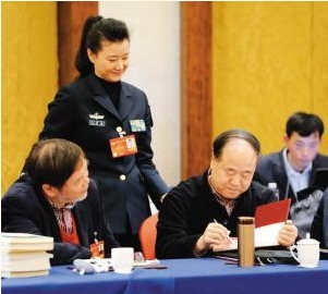 宋祖英(中)两会期间向诺贝尔文学奖获奖者莫言(右)索要签名