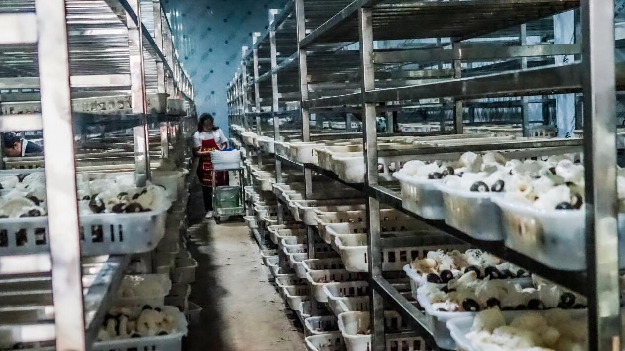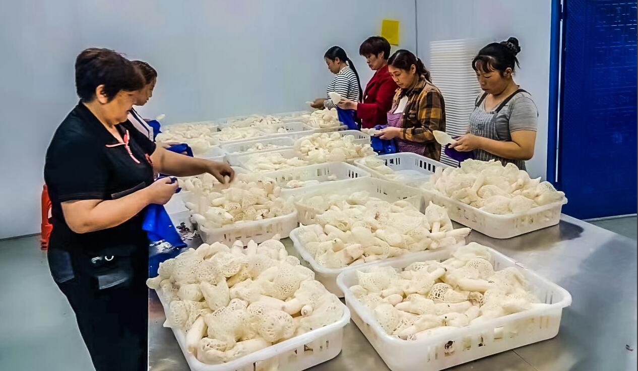 穆总和基地管理员告诉艺术家们说,我们基地里刚出土后的红托竹荪呈米黄色,网状好,无异味,您闻一下就有清香味,而且工人马上采摘,不超出两个小时,如两个小时以后就蔫了,不新鲜。采摘后的竹荪蛋、网状竹荪马上就用车送到公司分拣车间,确保打包发向全国各地消费者手里的鲜红托竹荪是分分秒秒采摘、时时刻刻新鲜……
