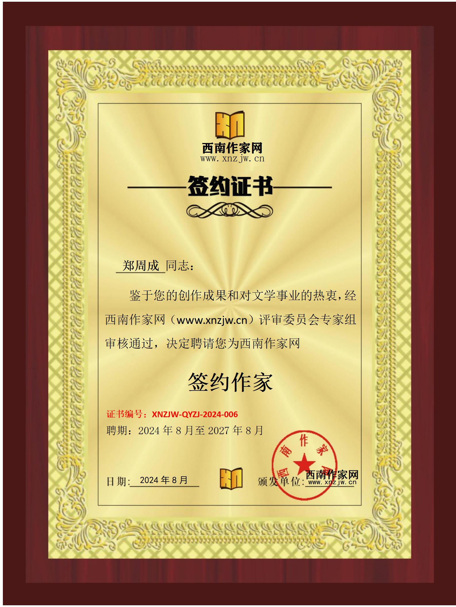经过西南作家网评审委员会的审核,贵州省兴义市作家郑周成同志于2024年8月6日与西南作家网签约成功,被聘请为“西南作家网签约作家”。