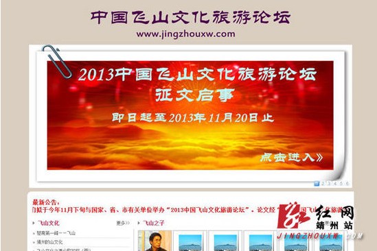 红网靖州站8月27日讯(分站记者 陈俊名) 据“2013中国飞山文化旅游论坛”筹委会办公室消息, 靖州县将于11月下旬举办2013中国飞山文化旅游论坛活动,面向全国征集飞山文化旅游主题作品,征集时间从即日起截止到2013年11月20日。