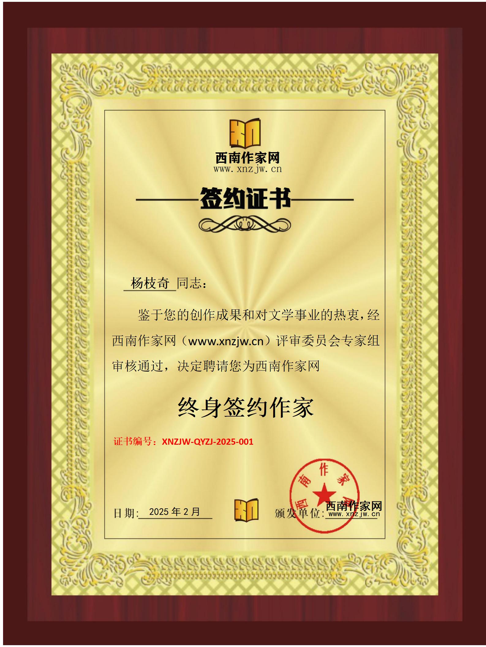 经过西南作家网评审委员会的审核,中华诗词学会会员、中国楹联学会会员、中国书画家联谊会会员、中诗协会员、贵州六盘水青年诗人杨枝奇于2025年2月8日与西南作家网续签成功,被聘请为“西南作家网终身签约作家”。
