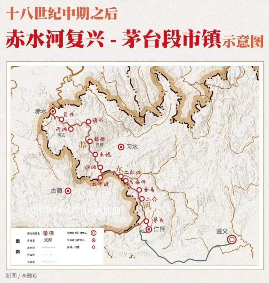 后来,赤水河又经历了两次大规模的疏浚,大大提高了赤水河的航运能力。运送盐巴的船只到达茅台仁岸后,分四路运送到贵州各地。一路经中枢、坛厂、长岗、鸭溪、南白、刀靶、过乌江运往贵阳,行程220公里,需13天;一路经鲁班场、吴马口、打鼓新场 (今金沙县城)运往安顺,全程230公里,需15天;一路经马蹄滩、黔西、大方运往毕节,全程320公里,需20天;再一路由南白转运至遵义分销至绥阳、正安、湄潭、凤冈。从这里可以看出茅台成为商业重镇,就是因为有盐运业的兴起。川盐入黔,带动了赤水河沿岸商贾云集,贸易频繁,也给赤水河600里沿岸带来了活力和清新的气息。茅台每天泊盐船过百只,车水马龙,船工、纤夫、马帮、商人上千人进出,客栈、戏楼、茶馆、酒肆、烟馆、杂货铺应运而生。卸盐之船顺流而下,又把黔北桐油、蚕丝、茶叶、白酒、药材等土特产载运到长江而销向全国,货畅其流,由此开启了“蜀盐走贵州,秦商聚茅台”的盛况,茅台由此成为当年水陆交通物资的最终集散地,发展成为黔北四大商业名镇之一。诗人张国华在《茅台竹枝词》中写道:“黔川接壤水流通,俗与泸州上下同,满眼盐船争泊岸,迎栏收点夕阳中。”,就是对川盐入黔的真实描写。