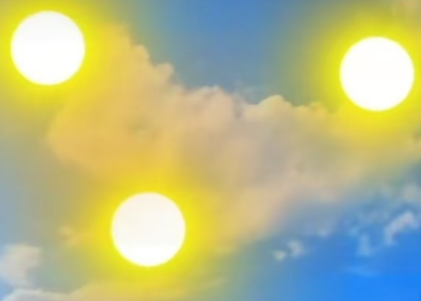 幻日,属于大气光学现象。高空中存在由大量冰晶组成的卷层云时,阳光射入冰晶后,经过两次折射分散成不同方向的光,这些分散的光进入人眼,就会让人感觉天空中有多个太阳,实际只有一个是真太阳,其余是阳光经冰晶折射形成的虚像。